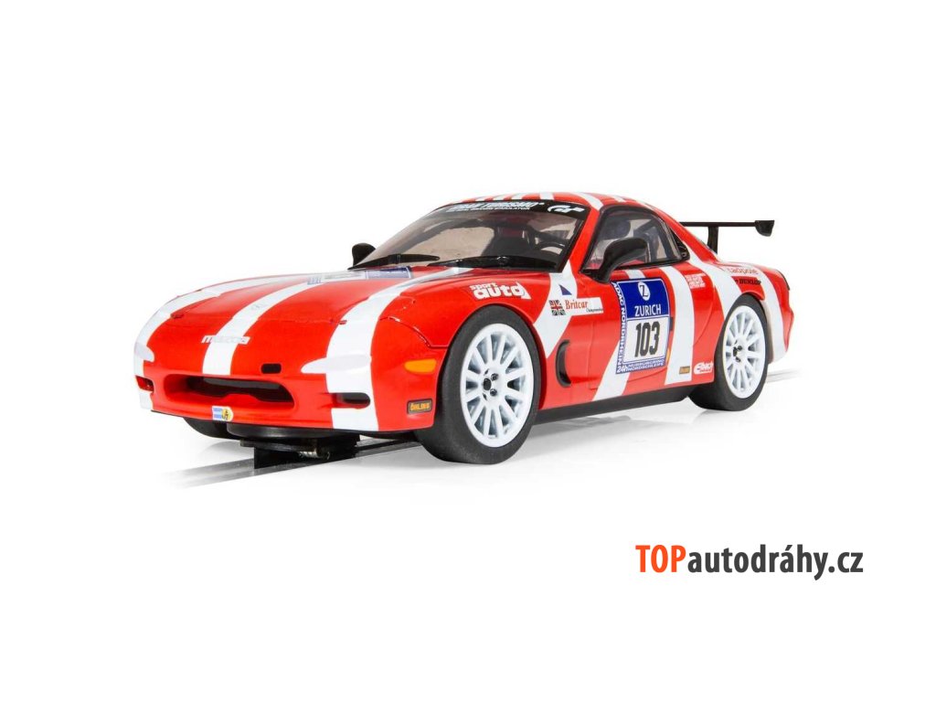 Autíčko pro autodráhu. Velikost: 1:32, 14 cm.Mazda RX-7 FD, skutečná ikona japonského inženýrství, se v roce 2007 ujal legendárního Nürburgringu 24 hodin a představil svou zdatnost s rotačním pohonem.