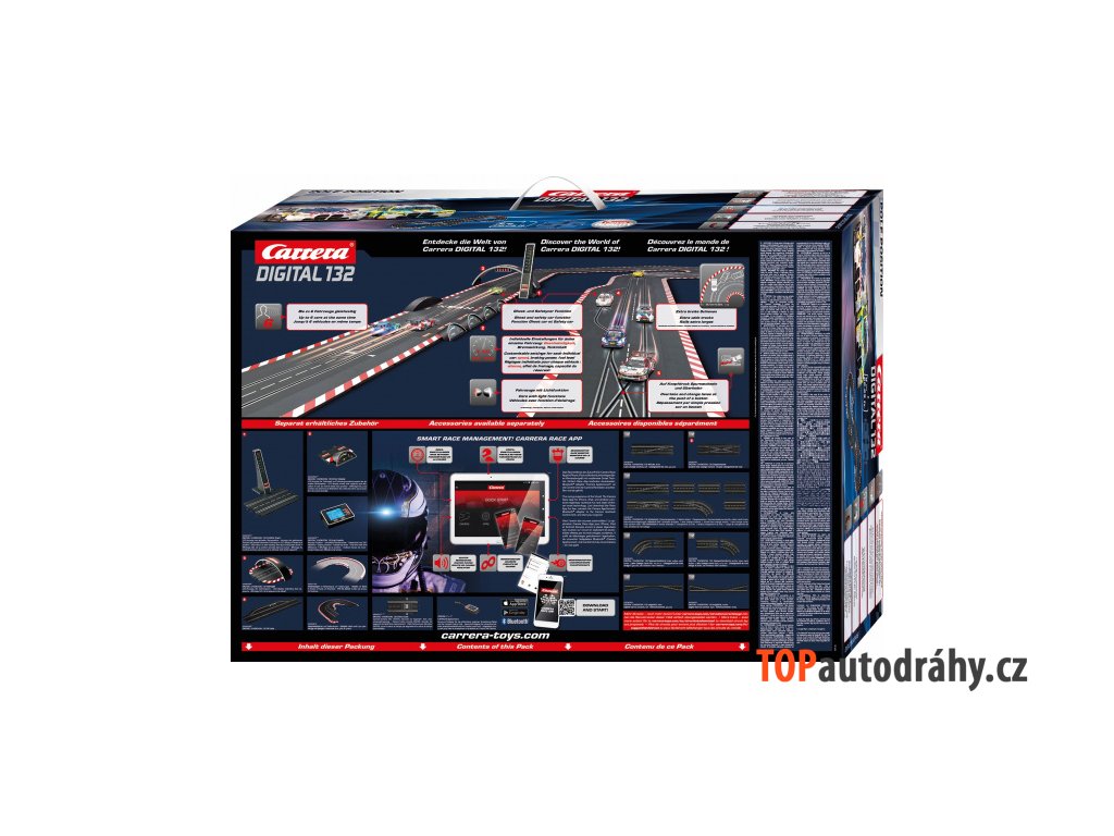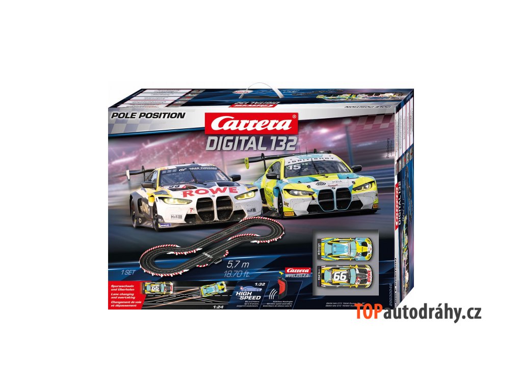 Autodráha Carrera Digital 132 dlouhá 5,7m s auty BMW M4 GT3 obsahuje rovinky, zatáčky, bezdrátové ovladače, díl na předjíždění zleva a zprava, napájecí díl a další díly.