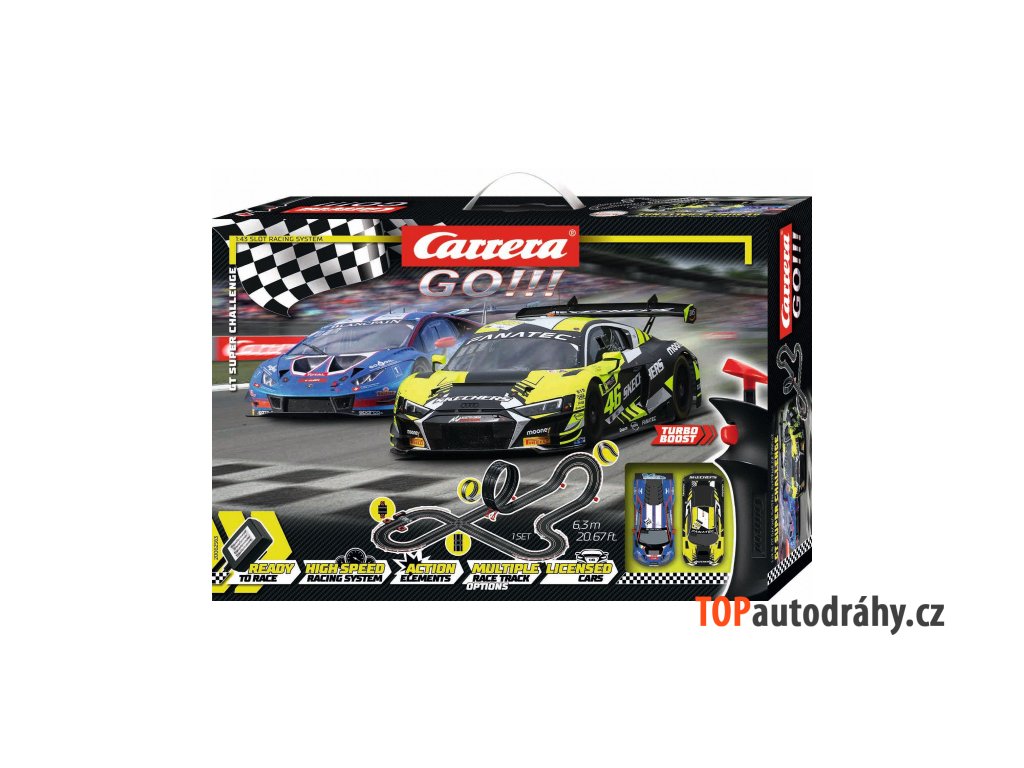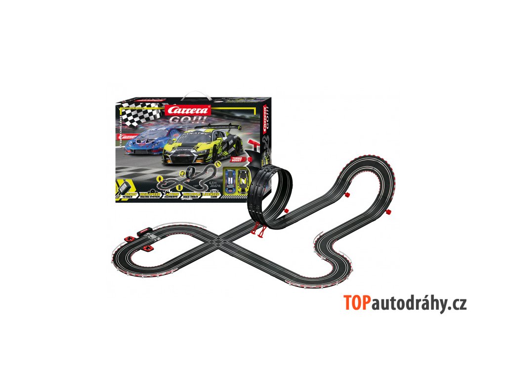 Produkt má poškozený obal, zboží je funkční a nepoškozené Zboží můžete reklamovat do 2 let od zakoupení. Autodráha Carrera GO!!! dlouhá 6,3m s auty Audi R8 LMS GT3 a Lamborghini Huracán GT3, obsahuje looping, křižovatku, rovinky, zatáčky, kolmou stěnu, díl s počítadlem kol a další díly. Můžete si sestavit další různé trati podle své fantazie. Délka trati: 6,3 m Rozměry po sestavení: 175 x 122 cm Obsah balení: 1x auto Audi R8 LMS GT3 evo II "Valentino Rossi, No.46" 1x auto Lamborghini Huracán GT3 "No.8" rovinky křižovatka looping kolmá stěna zatáčky 1x napájecí díl (61666) 1x díl s počítadlem kol (88107) 2x ovladač rychlosti (61663) 1x trafo Podpěry, mantinely, kontaktní kartáčky, vodící lišty, návod GO!!! - Turbo rychlost ve světě autodráh Carrera - měřítko dráhy 1:43 - měřítko aut 1:43 - propojení autodráhy s tabletem nebo mobilním telefonem (přes díl 61664 PitStop hry) - všechny sety jsou vybaveny ovladačem rychlosti s funkcí Turbo - všechna auta mají dvojité kontaktní kartáčky pro lepší přilnavost k dráze - všechna auta mají magnet - díky systému svorek se dráha snadno sestavuje i rozebírá - přesné a stabilní provedení drah, včetně výškově nastavitelných podpěr - detailní, tampónově potištěné vozy - exkluzivní celosvětová licence aut F1 Ferrari, Red Bull - originální licence Tlapková Patrola, Mimoni, Disney-Pixar Cars, Star Wars, Nintendo, Sonic - široká nabídka příslušenství (most, počítadlo kol, skokánek, kruhový objezd, rozšiřující sety, rallye díly a další díly pro ještě větší zábavu pří závodění - velmi kvalitní zpracování - sety obsahují napájecí díl, mechanické počítadlo kol, 2x ovladač rychlosti, 2x auto, mantinely, spojky dráhy, český návod - vhodné pro děti od 6 let - součástí každého setu jsou náhradní kontaktní kartáčky pro auta - analogový autodráhový systém CARRERA znamená ve španělštině závod a jedno Vám můžeme zaručit. Jakmile rozbalíte krabici s logem Carrera, rozproudí se Vaše závodní krev na nejvyšší otáčky a je jedno na jakém okruhu a s jakým autem budete zrovna závodit. Tento pocit zažívají tisíce fanoušků již od roku 1963, kdy značka Carrera spatřila svou první závodní dráhu. Během následujících více než čtyřiceti let, se Carrera probojovala až na úplnou špičku v oblasti autodráh, aut a jejich příslušenství. Dnes nabízí produkty nejvyšší kvality, které jsou určené nejen dětem ale i dospělým, pro které se staly autodráhy hobby na celý život.Doplňkové parametry
