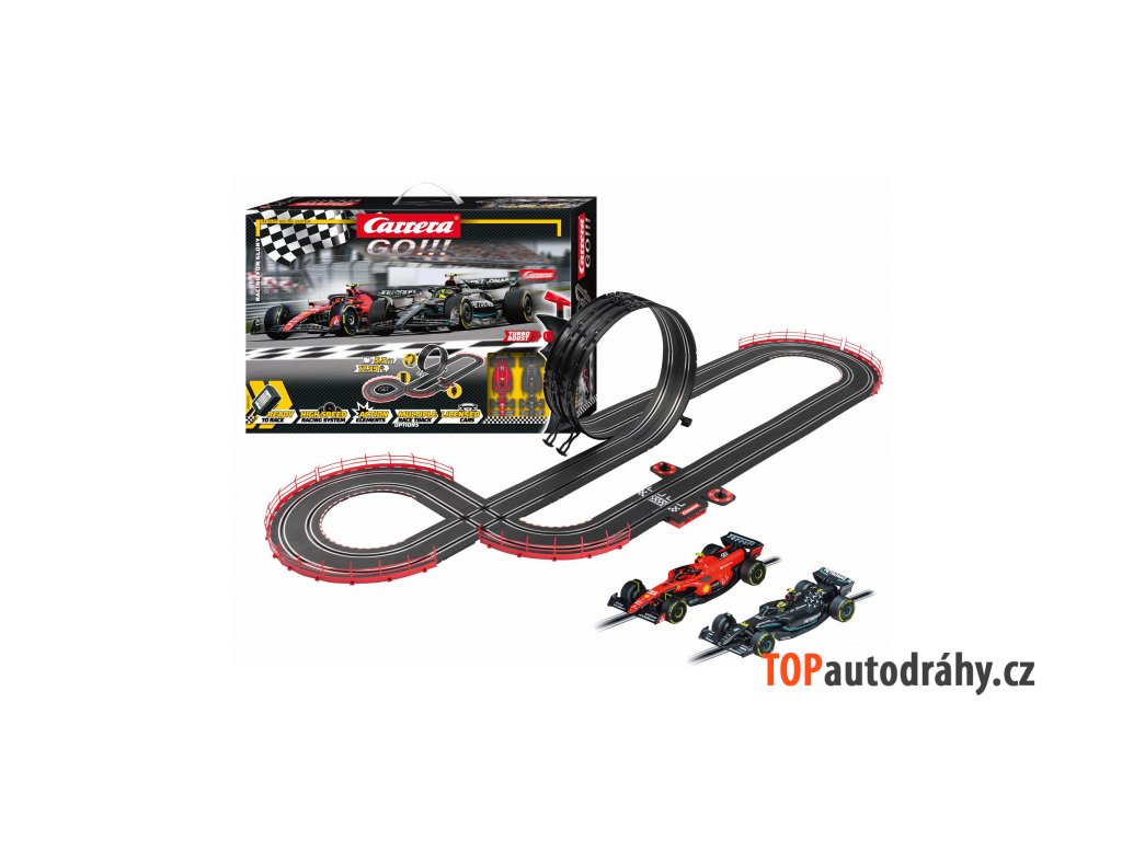 Autodráha Carrera GO!!! dlouhá 5,3m s auty F1 Ferrari a Mercedes, obsahuje looping, křižovatku, rovinky, zatáčky, díl s počítadlem kol a další díly. Můžete si sestavit další různé trati podle své fantazie.