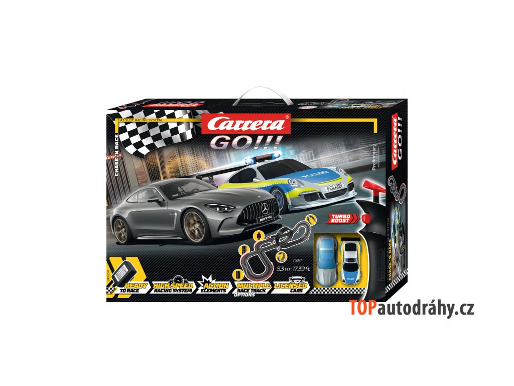 Produkt má poškozený obal, zboží je funkční a nepoškozené Zboží můžete reklamovat do 2 let od zakoupení. Autodráha Carrera GO!!! dlouhá 5,3m s auty Mercedes-AMG GT 63 a policejním Porsche 911 GT3, obsahuje looping, křižovatku, rovinky, zatáčky, kolmou stěnu, díl s počítadlem kol a další díly. Můžete si sestavit další různé trati podle své fantazie. Délka trati: 5,3 m Rozměry po sestavení: 180 x 75 cm Obsah balení: 1x auto Porsche 911 GT3 "Polizei" 1x auto Mercedes-AMG GT 63 - Hyperblue rovinky křižovatka zúžení dráhy looping kolmá stěna zatáčky 1x napájecí díl (61666) 1x díl s počítadlem kol (88107) 2x ovladač rychlosti (61663) 1x trafo Podpěry, mantinely, kontaktní kartáčky, vodící lišty, návod GO!!! - Turbo rychlost ve světě autodráh Carrera měřítko dráhy 1:43 měřítko aut 1:43 všechny sety jsou vybaveny ovladačem rychlosti s funkcí Turbo všechna auta mají dvojité kontaktní kartáčky pro lepší přilnavost k dráze všechna auta mají magnet díky systému svorek se dráha snadno sestavuje i rozebírá přesné a stabilní provedení drah, včetně výškově nastavitelných podpěr detailní, tampónově potištěné vozy exkluzivní celosvětová licence aut F1 Ferrari, Red Bull originální licence Tlapková Patrola, Mimoni, Disney-Pixar Cars, Star Wars, Nintendo, Sonic široká nabídka příslušenství (most, počítadlo kol, skokánek, kruhový objezd, rozšiřující sety, rallye díly a další díly pro ještě větší zábavu pří závodění velmi kvalitní zpracování sety obsahují napájecí díl, mechanické počítadlo kol, 2x ovladač rychlosti, 2x auto, mantinely, spojky dráhy, český návod vhodné pro děti od 6 let součástí každého setu jsou náhradní kontaktní kartáčky pro auta analogový autodráhový systém CARRERA znamená ve španělštině závod a jedno Vám můžeme zaručit. Jakmile rozbalíte krabici s logem Carrera, rozproudí se Vaše závodní krev na nejvyšší otáčky a je jedno na jakém okruhu a s jakým autem budete zrovna závodit. Tento pocit zažívají tisíce fanoušků již od roku 1963, kdy značka Carrera spatřila svou první závodní dráhu. Během následujících více než čtyřiceti let, se Carrera probojovala až na úplnou špičku v oblasti autodráh, aut a jejich příslušenství. Dnes nabízí produkty nejvyšší kvality, které jsou určené nejen dětem ale i dospělým, pro které se staly autodráhy hobby na celý život.Doplňkové parametry