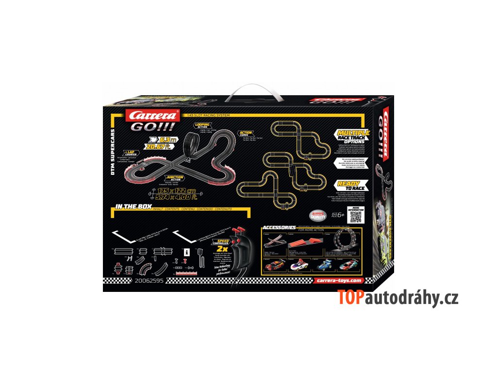 Autodráha Carrera GO!!! dlouhá 6,3m s auty série GT3 Audi R8 LMS a Lamborghini Huracán obsahuje křižovatku, rovinky, zatáčky, klopenou zatáčku, looping, díl s počítadlem kol a další díly. Můžete si sestavit další různé trati podle své fantazie.