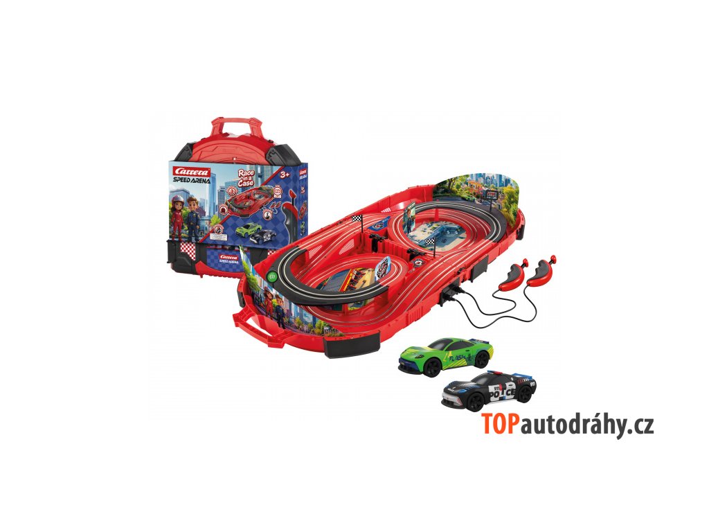 Autodráha Carrera Speed Arena dlouhá 2,77m s auty Police car a Green racer, pro děti od 3 let, na baterie (4xAA nebo se dá nabít pomocí USB-C). Autodráha je balena v přenosném kufříku a obsahuje rovinky, zatáčky, ovladače, vestavěné počítadlo kol a dekorace s tématikou policejní honičky. Délka trati: 2,77 m Rozměry po sestavení: 100 x 46 cm Obsah balení: 1x auto Police car 1x auto Green Racer rovinky zatáčky přenosný kufřík vestavěné počítadlo kol 1x napájecí díl 2x ovladač rychlosti Podpěry, mantinely, návod Neobsahuje baterie (4x AA), ani nabíječku USB-C CARRERA znamená ve španělštině závod a jedno Vám můžeme zaručit. Jakmile rozbalíte krabici s logem Carrera, rozproudí se Vaše závodní krev na nejvyšší otáčky a je jedno na jakém okruhu a s jakým autem budete zrovna závodit. Tento pocit zažívají tisíce fanoušků již od roku 1963, kdy značka Carrera spatřila svou první závodní dráhu. Během následujících více než čtyřiceti let, se Carrera probojovala až na úplnou špičku v oblasti autodráh, aut a jejich příslušenství. Dnes nabízí produkty nejvyšší kvality, které jsou určené nejen dětem ale i dospělým, pro které se staly autodráhy hobby na celý život.